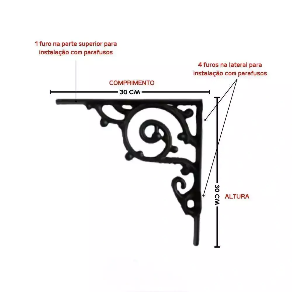 Suporte mão francesa em ferro fundido nº3 30x30 kit 8 un. Esta cantoneira permite montar suas elaboradas prateleiras com tábuas, vidros e outros materiais. Mão francesa totalmente produzida em ferro fundido,